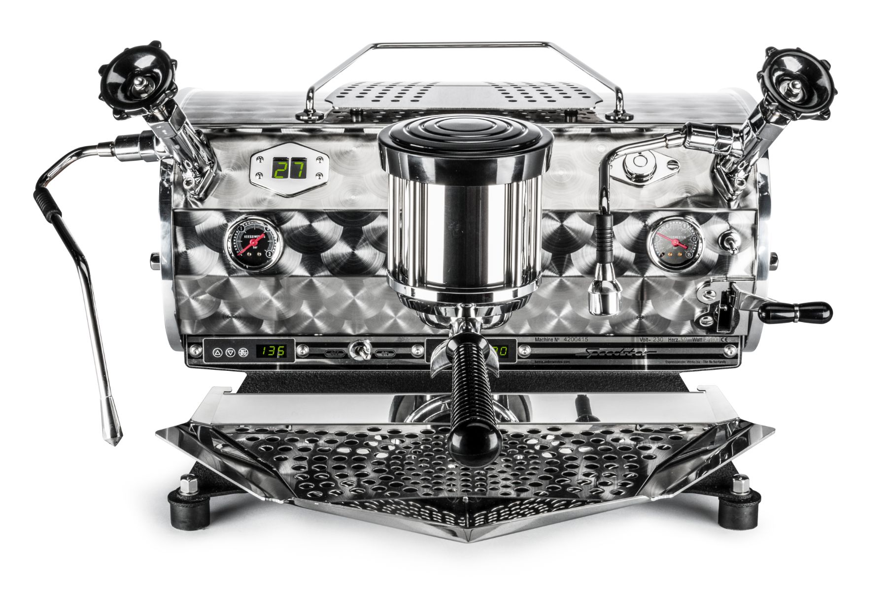 The Speedster is equipped with two separately functioning boilers: one large steam boiler to produce hot water and steam, one boiler with group to heat water to brew coffee. Each boiler has its own electronic temperature controller system, heating element and safety devices, offering extremely precise temperature stability.