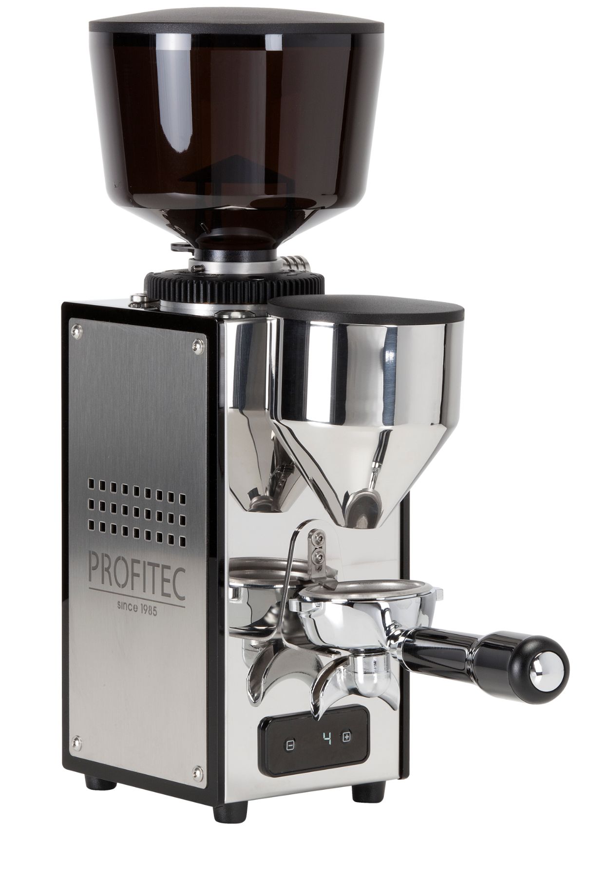 The ProT64 is a professional grinder with a direct grinding function and a programmable grind time in 10th of a second. Handling is as easy as it is simple: Insert the porta filter, press the portioning button-done. The straight-forward, simple industrial look of the high-end, stainless steel housing with side panels made of Plexiglas is perfectly complemented by the tinted bean hopper